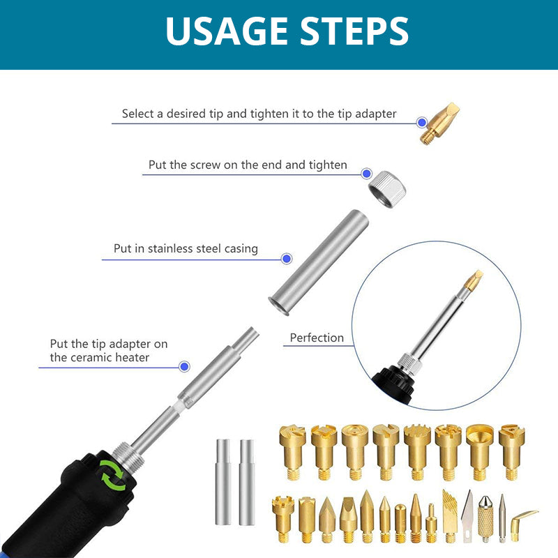 Hochwertiges, schnell aufheizendes Brandmalerei-Set mit 35 verschiedenen Lötspitzen und Zubehörteilen, das sich für alle Erfahrungsstufen eignet, von Anfängern bis hin zu erfahrenen und professionellen Anwendern.