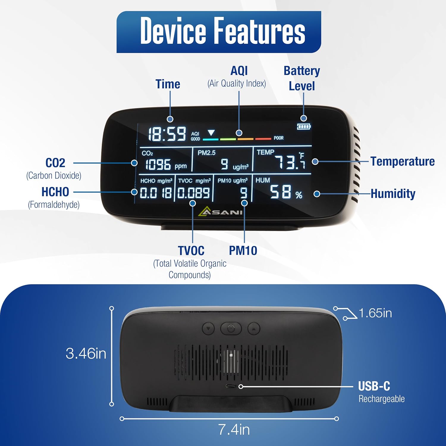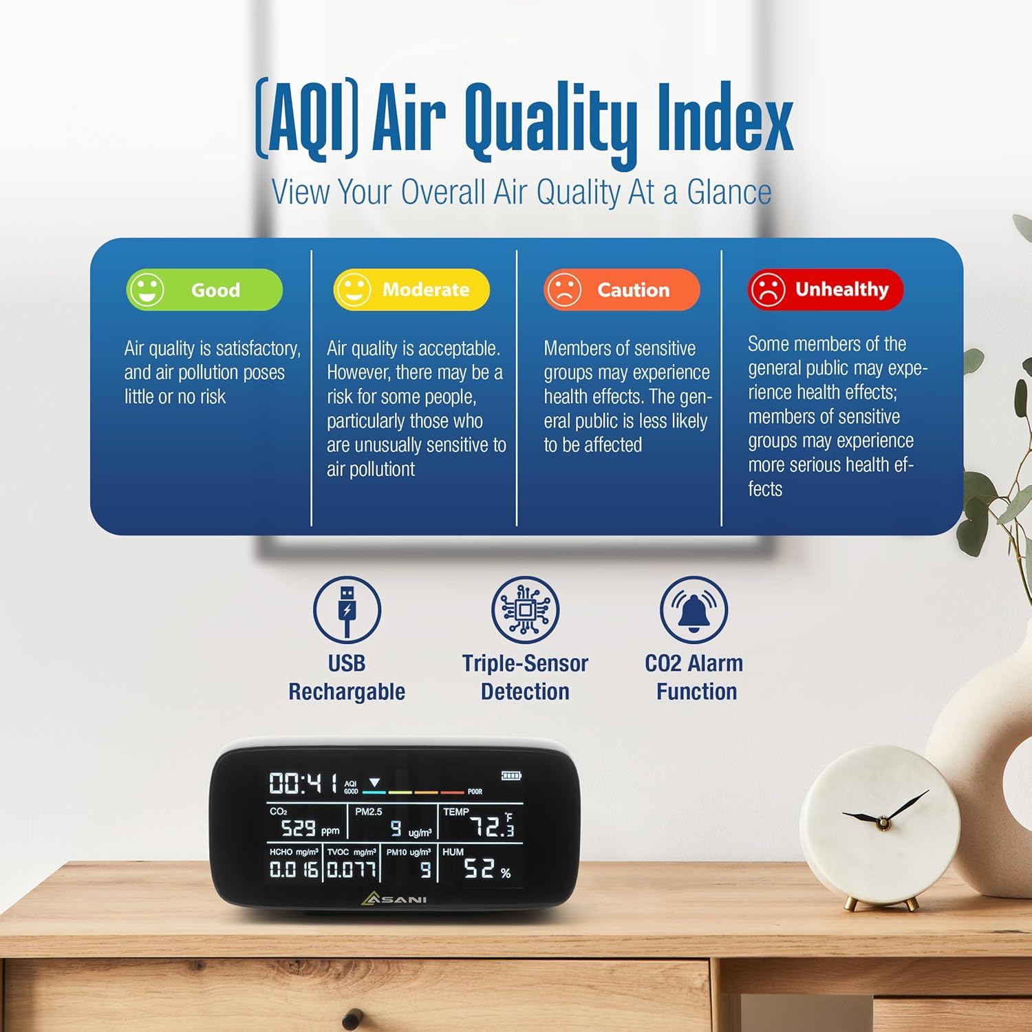 Dieses 9-in-1 Luftqualitätsmessgerät überwacht zuverlässig CO2, TVOC, Formaldehyd (HCHO), AQI, PM2.5, PM10, Luftfeuchtigkeit und Temperatur. Hochsensible Sensoren liefern präzise Echtzeitdaten für eine gesündere Wohn- und Arbeitsumgebung.