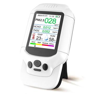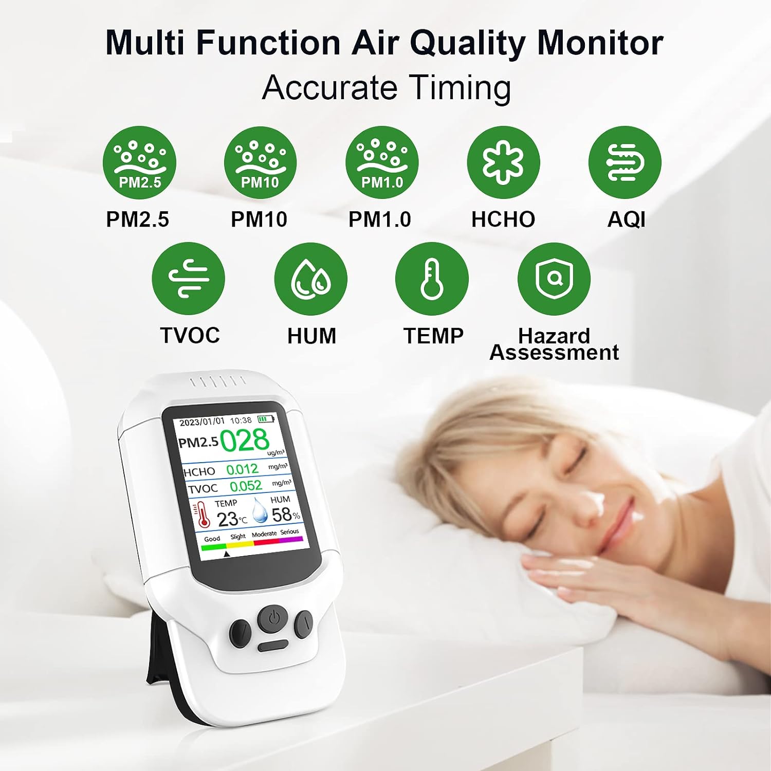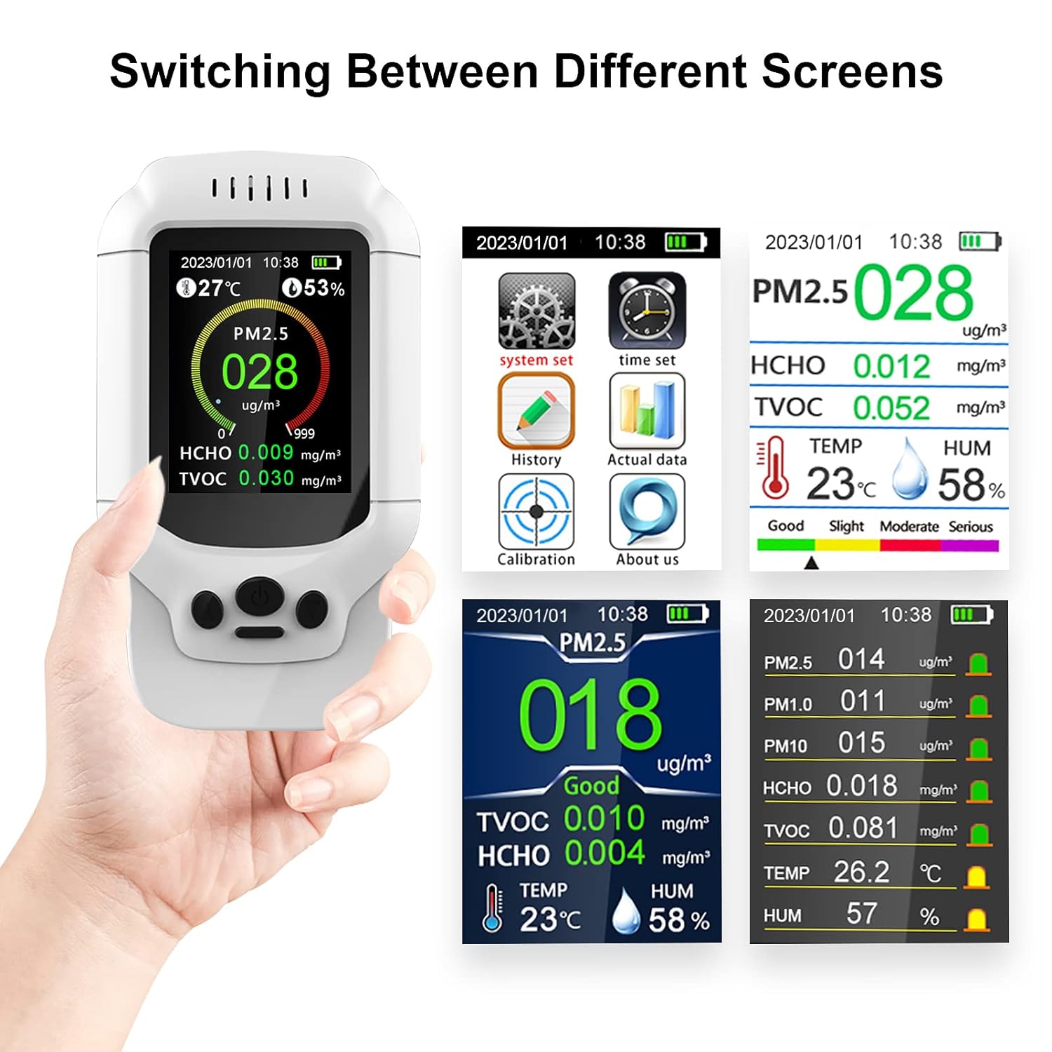 Dieses Raumluftqualitätsmessgerät misst präzise Temperatur (in °C/°F), Luftfeuchtigkeit und verschiedene Luftqualitätsparameter, darunter die Konzentrationen von Formaldehyd, die Gesamtkonzentration flüchtiger organischer Verbindungen (TVOC), die die meisten Gerüche verursachen, sowie Feinstaubpartikel (PM2.5/PM1.0/PM10), die tief in die Atemwege eindringen und die Lungenbläschen erreichen.