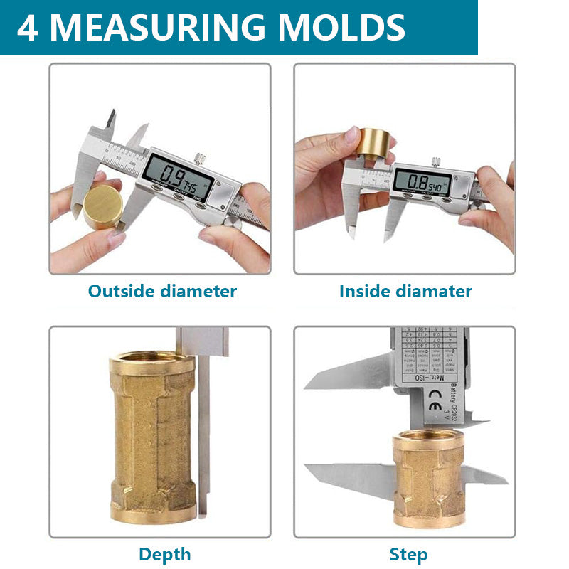Der digitale Messschieber verfügt über 4 Messmodi, mit denen Innendurchmesser, Außendurchmesser, Tiefe und Stufen mit zwei Messbackenpaaren und einer Messspitze gemessen werden können. Die verschiedenen Messmodi eröffnen vielfältige Anwendungsmöglichkeiten, und der Messvorgang ist zudem sehr komfortabel.
