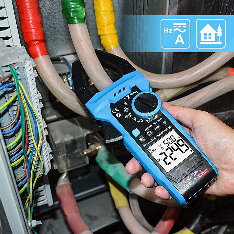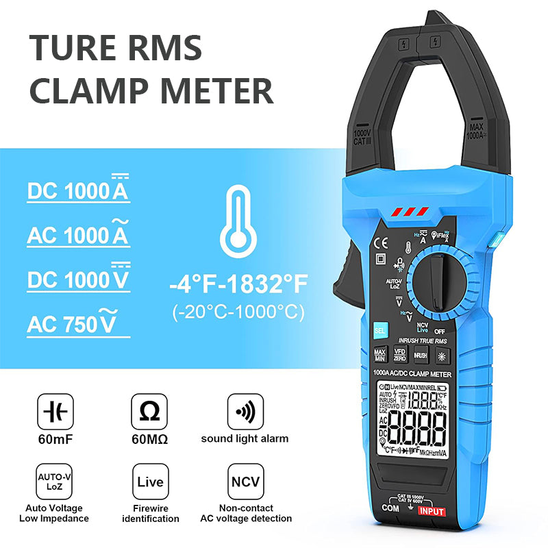 Dieses Zangenmultimeter kann 1000 Ampere AC/DC-Strom, 1000 V DC und 750 V AC-Spannung, Einschaltstrom, Phasenprüfung, Frequenz, Widerstand, Kapazität, Diode, Durchgang und Temperatur präzise messen. Ein perfektes Werkzeug zur Fehlersuche, mit dem Sie elektrische Probleme im Auto, in Laboren, Fabriken, in der Industrie oder zu Hause schnell und sicher lösen können.