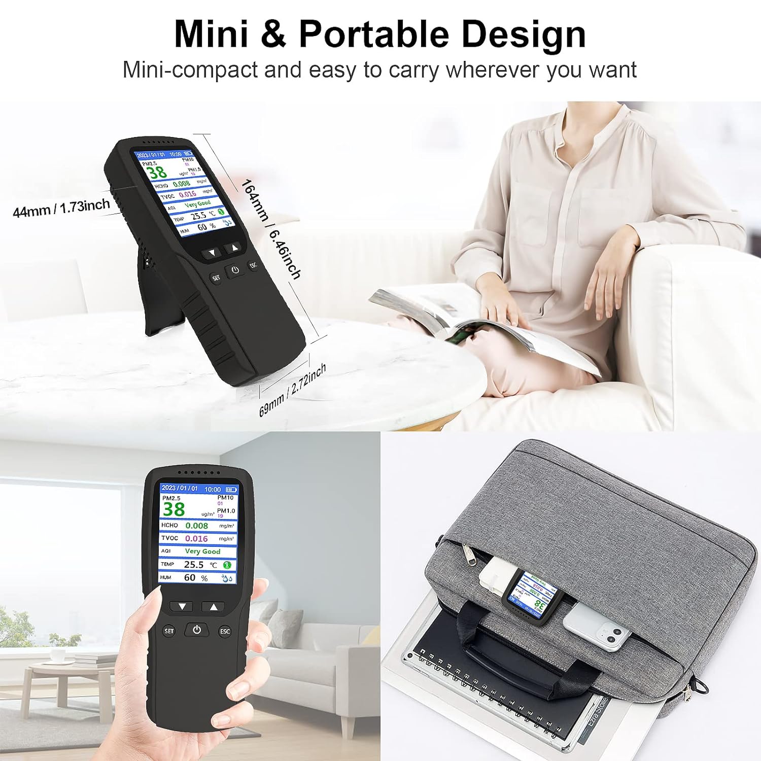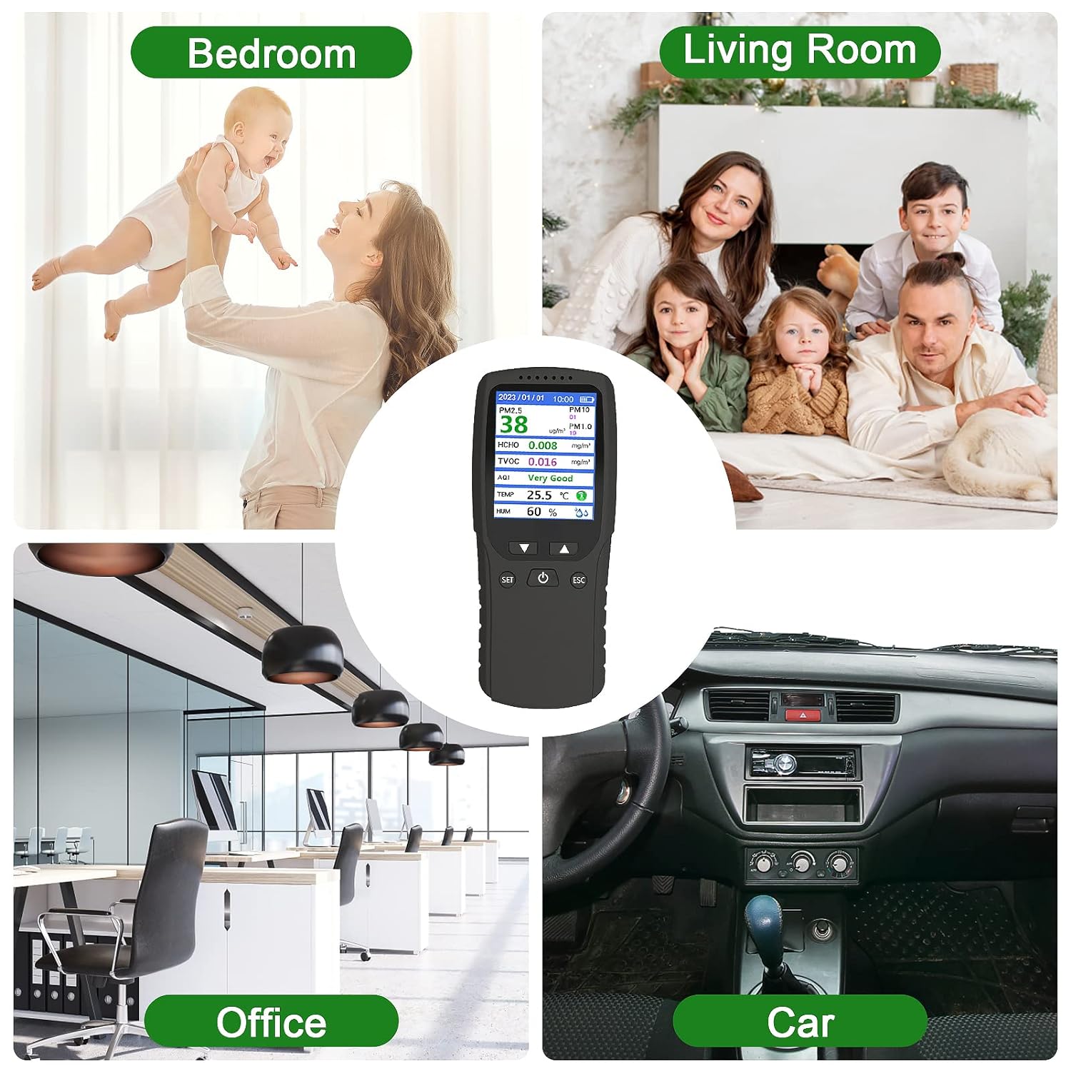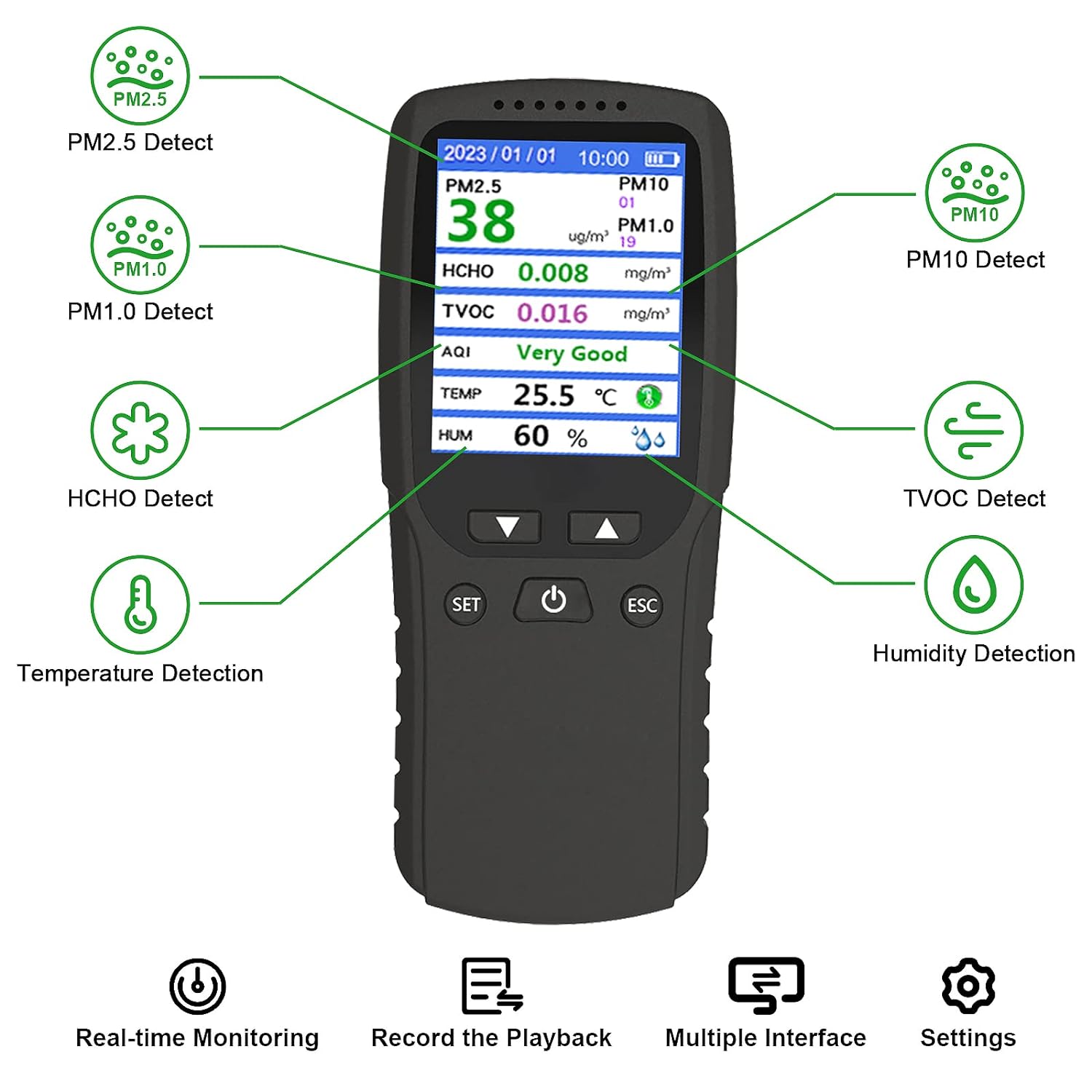 Dieser 8-in-1-Multifunktionsdetektor überwacht umfassend verschiedene Luftqualitätsparameter: AQI, PM1,0, PM2,5, PM10, TVOC, HCHO, Luftfeuchtigkeit und Temperatur. So schützen Sie Ihre Atemluft in Echtzeit.
