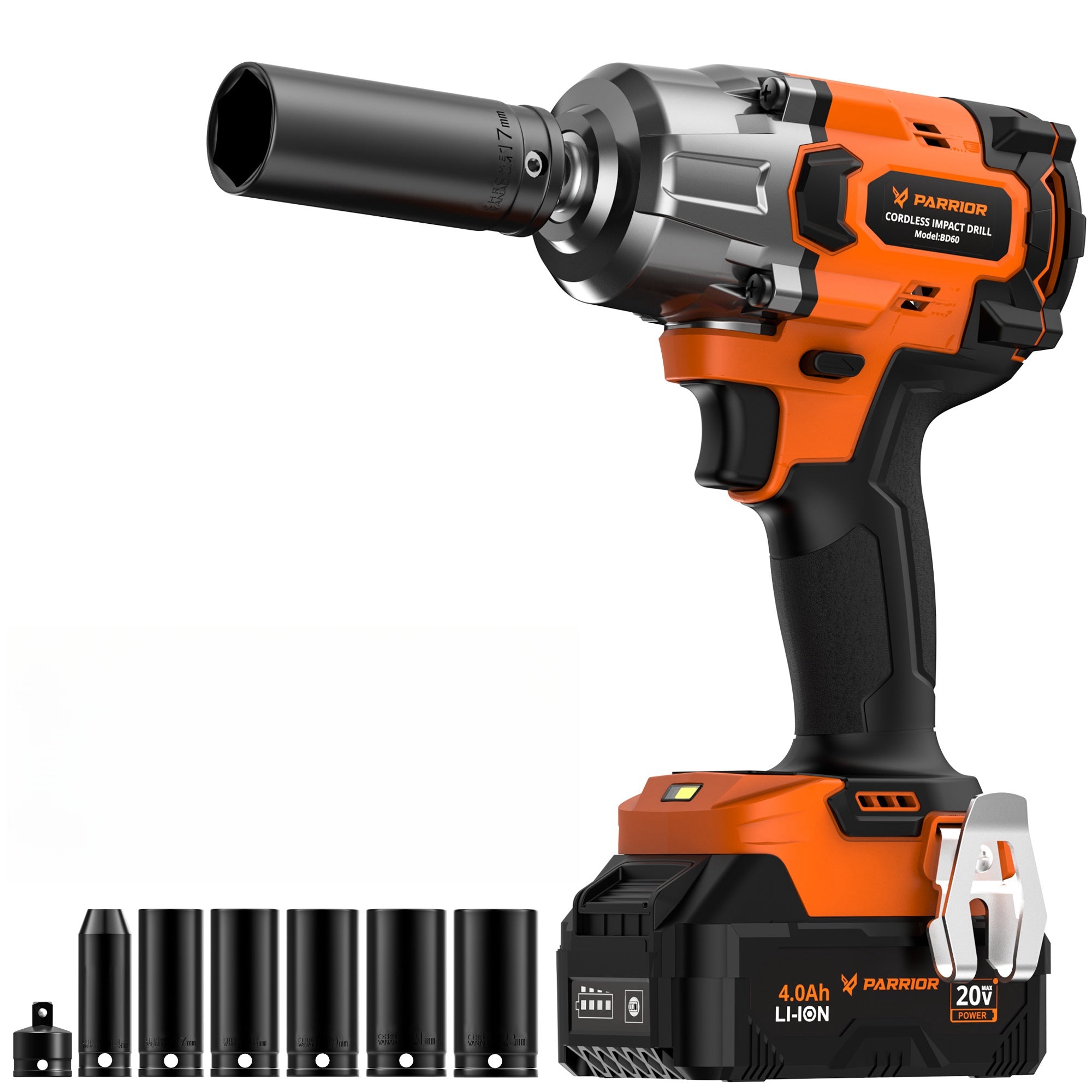 Lieferumfang: 1× Akku-Schlagschrauber, 1× 4Ah Akku, 1× 2.0Ah Schnellladegerät, 6× Stecknüsse (14/17/18/19/21/22 mm), 1× 1/2" auf 3/8" Adapter – alles, was Profis und Heimwerker brauchen, in einem Set.