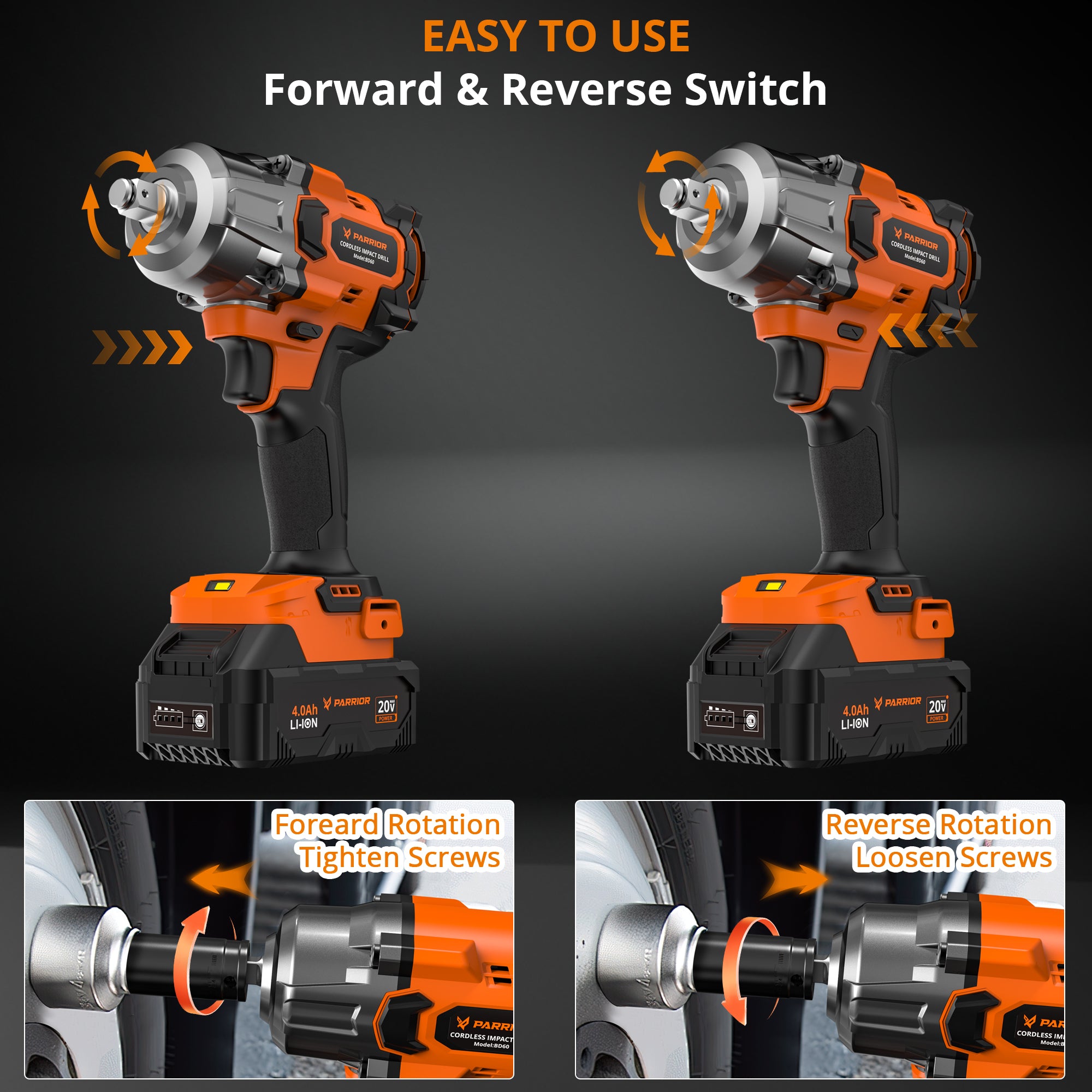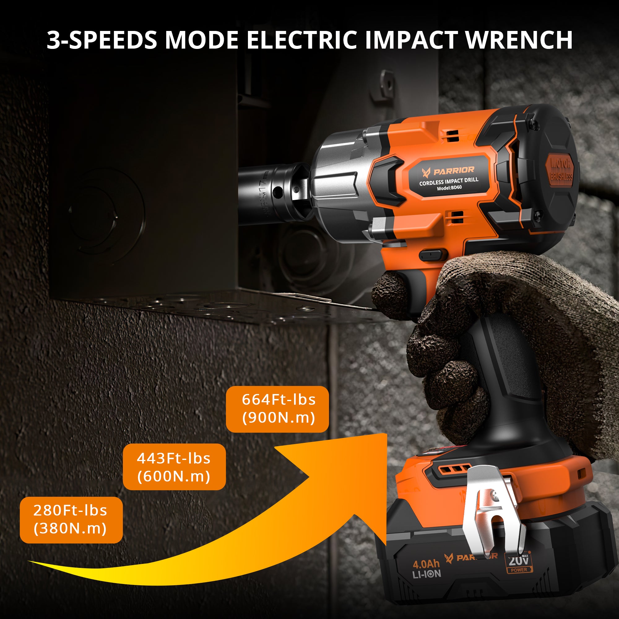 Der PARRIOR Akku-Schlagschrauber bietet 3 Leistungsstufen (380 / 600 / 900 Nm) für präzise Anpassung – ideal für leichte Schraubarbeiten sowie anspruchsvolle Aufgaben wie das Lösen festsitzender oder verrosteter Muttern.