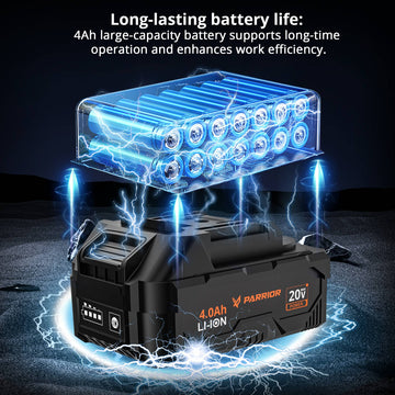 Der leistungsstarke 4Ah Lithium-Akku ermöglicht lange Arbeitszeiten ohne Unterbrechung. Mit dem 2.0Ah Schnellladegerät ist der Akku in nur 60 Minuten wieder einsatzbereit – weniger Wartezeit, mehr Produktivität.