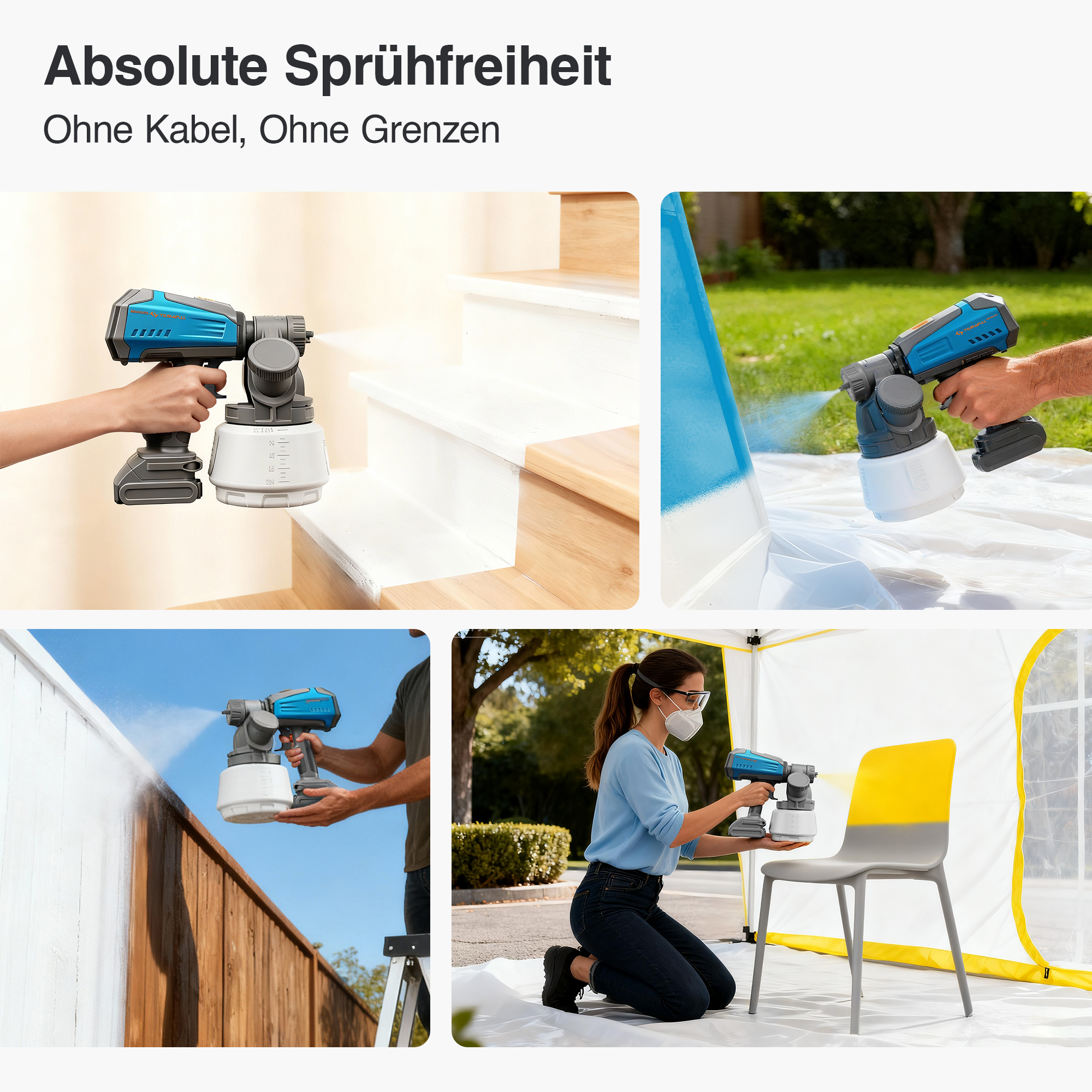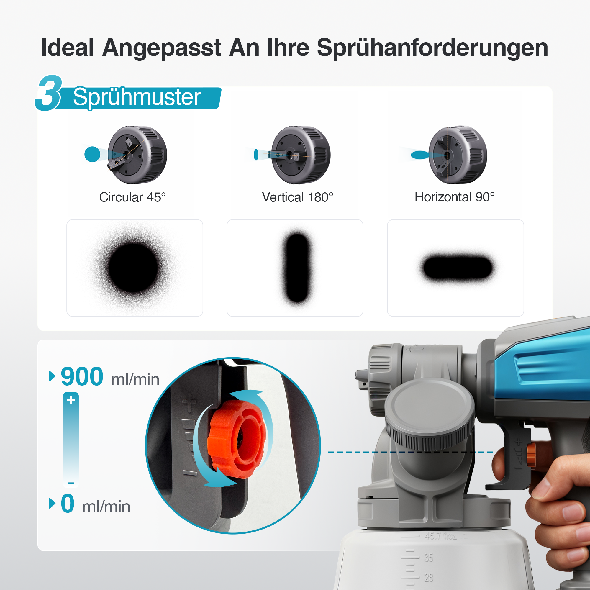 Drei Sprühmuster (horizontal, vertikal, rund) und variable Durchflusskontrolle (0–900 ml/min) machen dieses Farbspritzgerät perfekt für jede Aufgabe – von filigranen Möbeln bis hin zu großen Wandflächen.