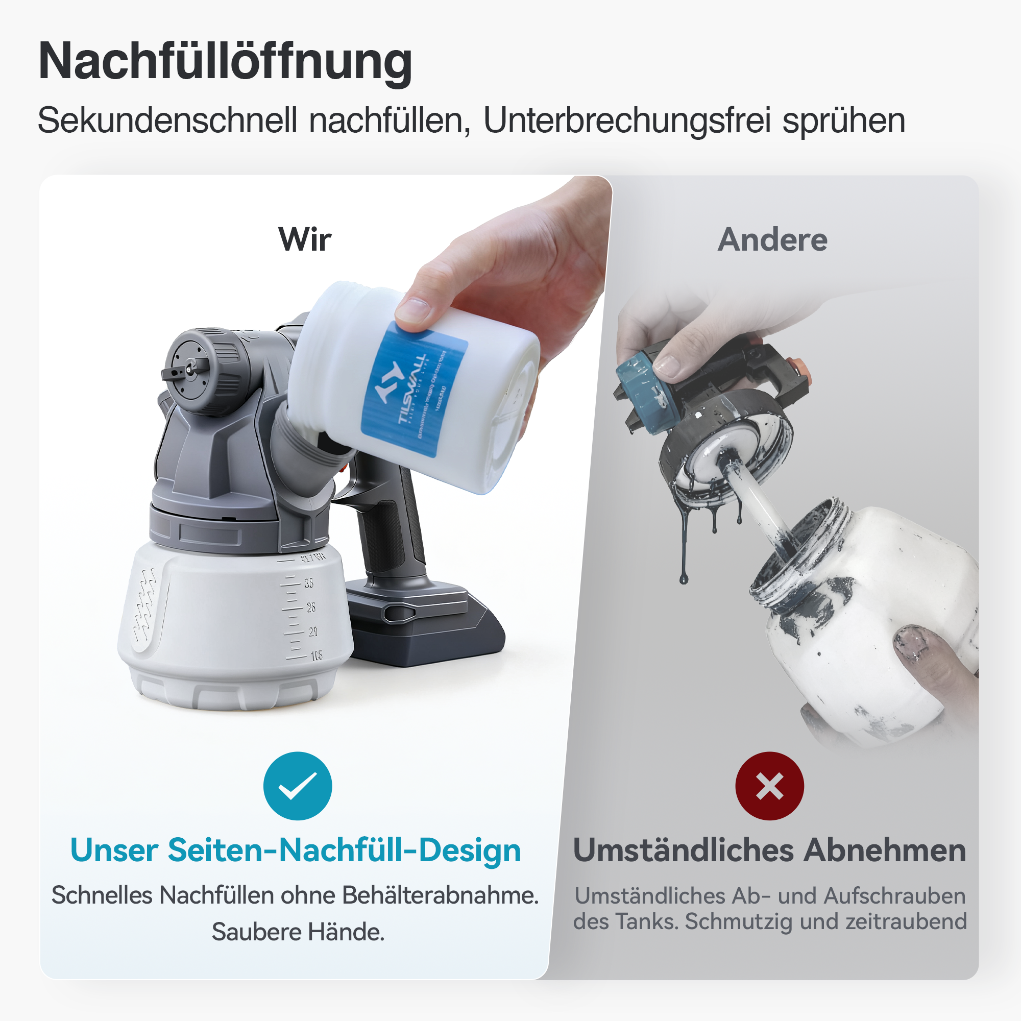 Das seitliche Befüllungssystem ermöglicht ein schnelles und sauberes Nachfüllen der Farbe, ohne den gesamten Behälter abschrauben zu müssen. Maximale Effizienz, minimale Verschmutzung.