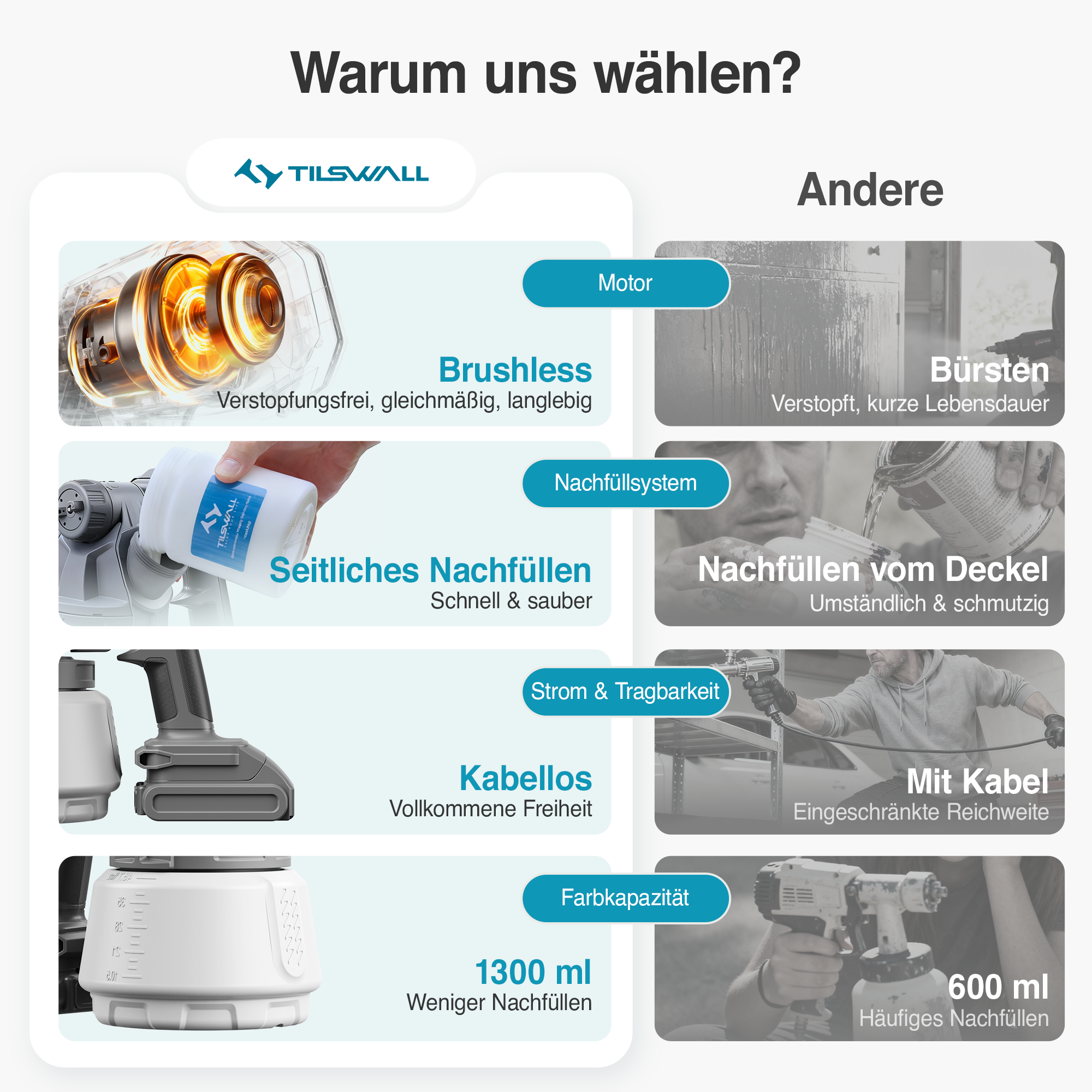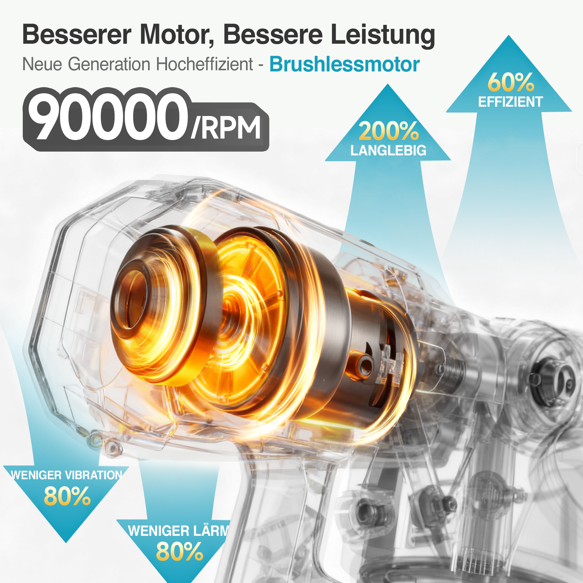 Unser leistungsstarker 90.000 RPM bürstenloser Motor gewährleistet eine gleichmäßige Sprühleistung, deutlich reduzierter Vibration und Geräusche sowie eine längere Lebensdauer. Profi-Tipp: Zur Vermeidung von anfänglichem Spritzen die Düse von der Oberfläche wegrichten – 2 Sekunden lang den Abzug leicht drücken, dann durchdrücken für feinsten Sprühnebel.